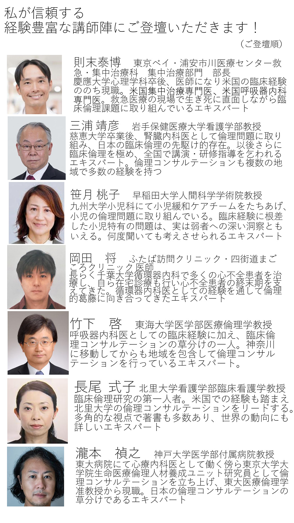 国際医療福祉大学大学院東京赤坂キャンパス公開講座実践者から学ぶ臨床倫理登壇講師陣
