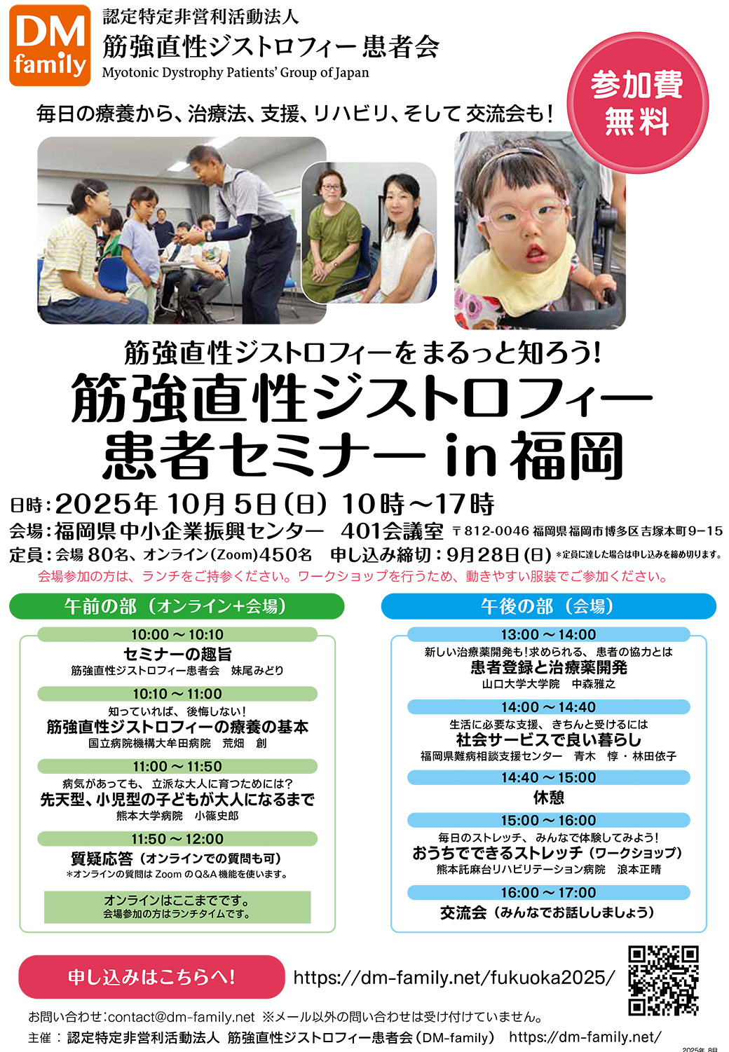 特定非営利活動法人筋強直性ジストロフィー患者会(DM-family)は、2025年10月5日(日)、筋強直性ジストロフィー患者セミナーin福岡を福岡県中小企業振興センター(福岡県福岡市博多区)で開催します。午前のセミナーは、オンラインで視聴可能です。