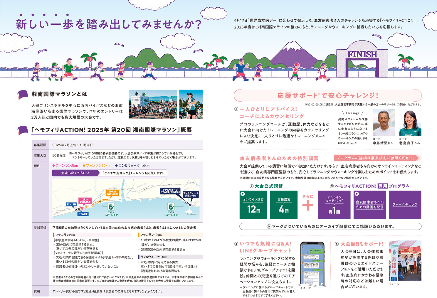 サノフィ株式会社(以下「サノフィ」)は、血友病患者さんの”やりたい”を応援するプロジェクト「ヘモフィリACTION!」の一環として、2025年12月7日(日)神奈川県湘南地区で開催予定の第20回湘南国際マラソンにチャレンジしたい血友病患者さんを募集します。