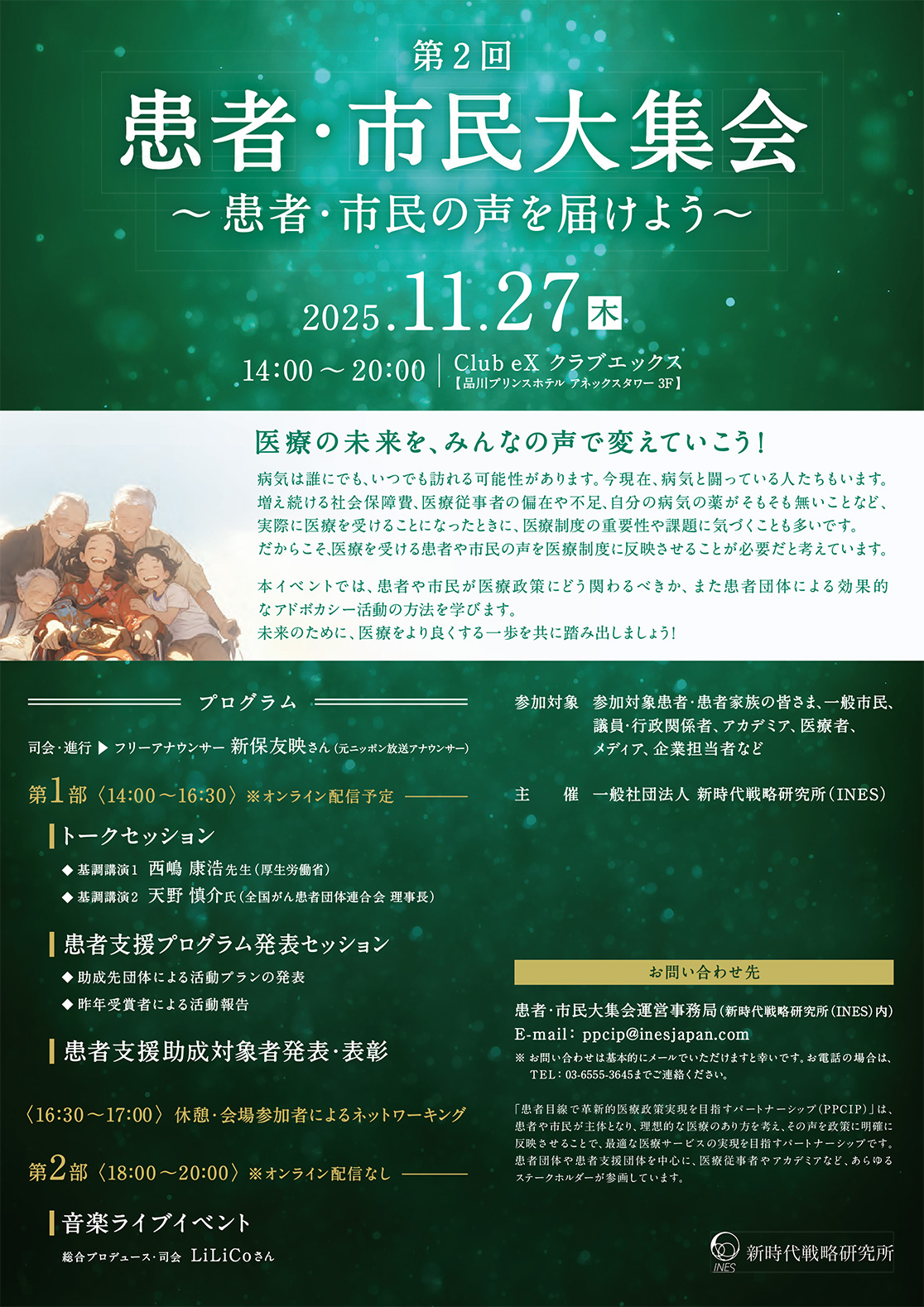 一般社団法人新時代戦略研究所(INES)は、第2回 患者・市民大集会 ~患者・市民の声を届けよう~を、2025年11月27日(木)、Club eX クラブエックス(東京都港区)で開催いたします。現在、第1部の申し込みを受け付けております。
