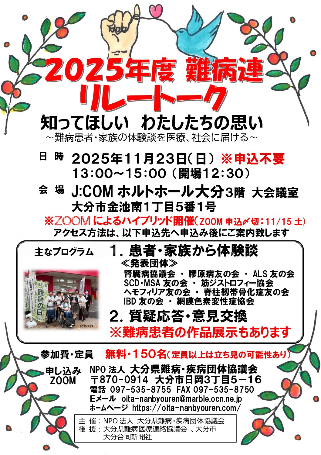 NPO法人 大分県難病・疾病団体協議会は、難病連リレートークを2025年11月23日(日)13時からハイブリッドで開催します。会場はJ:COMホルトホール大分(大分県大分市)、オンラインはZOOMを使用します。