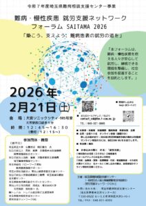 一般社団法人埼玉県障害難病団体協議会は、難病・慢性疾患就労支援ネットワークフォーラムSAITAMA 2026「築こう、支えよう、難病患者への就労の道を」を、2026年2月21日(土)、対面とオンラインのハイブリッドで開 […]